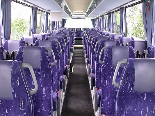Fullt utrustad turistbuss med säkerhetsbälten, 220V, Air Condition, DVD-spelare, CD-växlare, litet pentry med kylskåp, kaffemaskin, toalett, fällbara ryggstöd, fällbara bord.